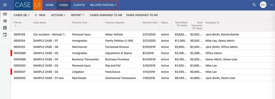 Restricted users only have access to cases assigned to them including case invoices. They have access to all clients and entities information but only access related cases if these cases are assigned to them. They do not have access to the other cases or the “ADMINISTRATION” area.