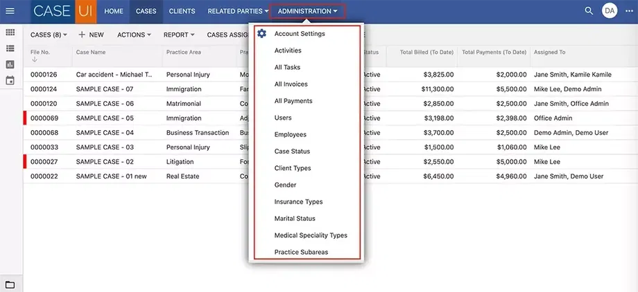 Under “ADMINISTRATION”, Administrators can manage the account details, manage users access, employees info, and many case and client drop down menus such as Practice Subareas, Client Types, etc.